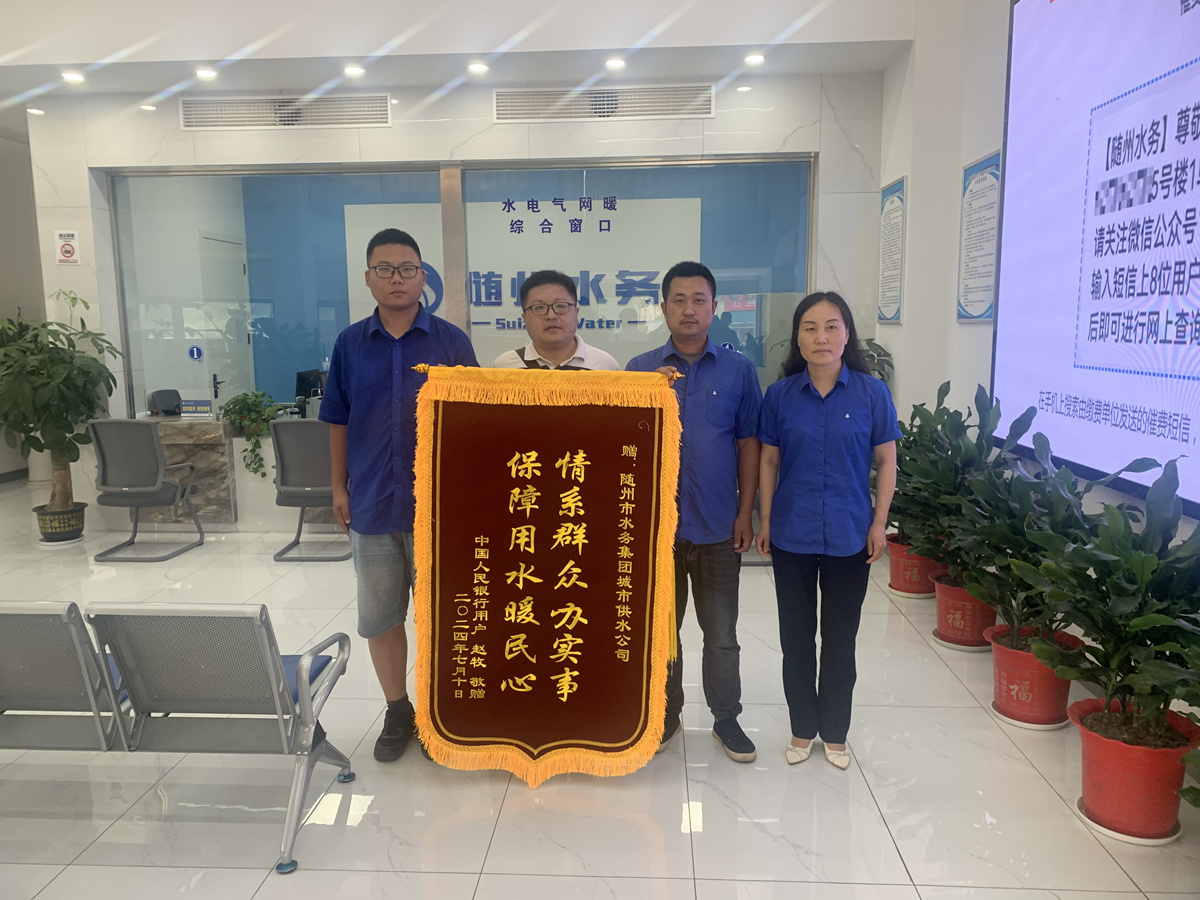 近日,中國人民銀行用戶將一面繡有“情系群眾辦實事 保障用水暖民心”的錦旗送到隨州市水務(wù)集團城市供水公司共享營業(yè)廳。感謝運維中心維修人員急用戶之所急、憂用戶之所憂、真心為用戶考慮,解決其用水問題。