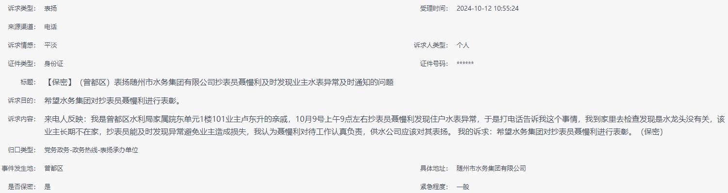 來電人反映:我是曾都區(qū)水利局家屬院東單元1樓101業(yè)主盧東升的親戚,10月9號上午9點左右抄表員聶慢利發(fā)現(xiàn)住戶水表異常,于是打電話告訴我這個事情,我到家里去檢查發(fā)現(xiàn)是水龍頭沒有關(guān),該業(yè)主長期不在家,抄表員能及時發(fā)現(xiàn)異常避免業(yè)主造成損失,我認(rèn)為聶慢利對待工作認(rèn)真負(fù)責(zé),供水公司應(yīng)該對其表揚。 我的訴求:希望水務(wù)集團對抄表員聶慢利進(jìn)行表彰。(保密) |