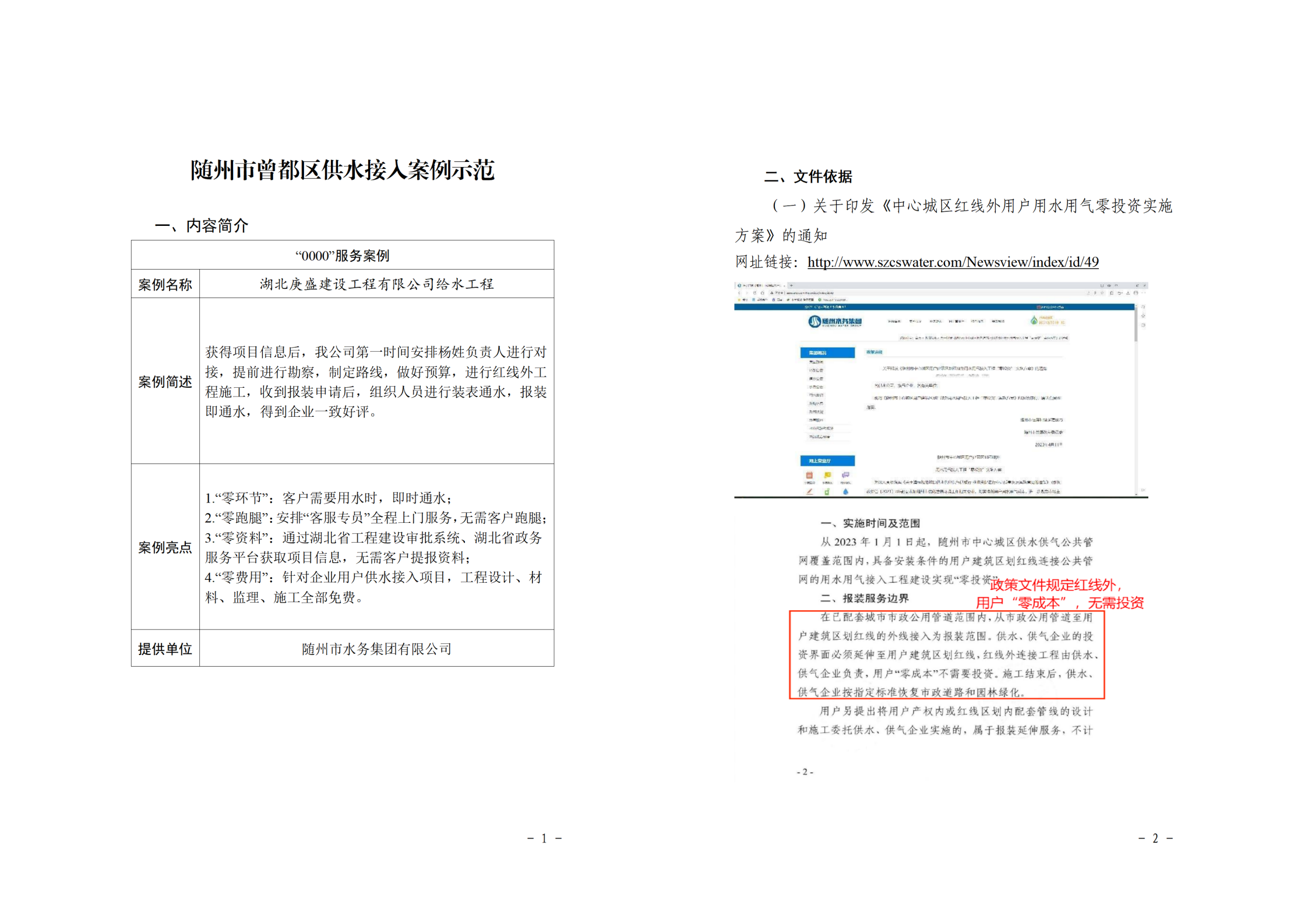 隨州市水務(wù)集團(tuán)主要職責(zé)是向隨州市中心城區(qū)、曾都區(qū)、隨縣以及高新區(qū)提供供水服務(wù),集團(tuán)公司下轄城市供水公司、建設(shè)工程公司、水質(zhì)檢測公司、隨縣供水公司、康潤實(shí)業(yè)公司5家全資子公司。下面展示隨州市曾都區(qū)供水接入案例示范。