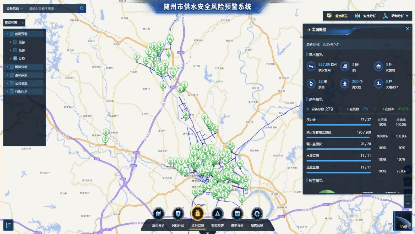 此次智慧水務建設的核心成果,是搭建起全市統(tǒng)一的智慧水務綜合管理平臺。這一平臺猶如功能強大的“中樞神經(jīng)系統(tǒng)”,高效匯聚著全市供水設施產(chǎn)生的海量實時運行數(shù)據(jù)。借助深度的數(shù)據(jù)挖掘、智能分析與可視化呈現(xiàn)技術,實現(xiàn)了從水源、水廠、管網(wǎng)到二次供水乃至用戶終端的全鏈條精細化管理。它不僅讓供水服務的響應速度得到顯著提升,更使隨州水務的運營效率大幅優(yōu)化,為城市水資源的科學調(diào)度和高效利用提供了堅實有力的決策支撐。