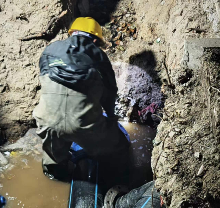 “末端”不末尾,問題不過夜。欣和電子位于高新區(qū)供水管網(wǎng)最末端,周邊聚集了多家24小時(shí)連續(xù)生產(chǎn)的企業(yè)。廠區(qū)用水報(bào)裝需在DN200管網(wǎng)破口接水,新安裝DN100機(jī)械表,既要穿越車流滾滾的主干道,又不能影響“鄰居”們一滴水的正常供應(yīng)。接到求助后,水務(wù)集團(tuán)建設(shè)工程公司立即啟動(dòng)“高新企業(yè)用水綠色通道”,青年突擊隊(duì)成員10分鐘集結(jié)完畢,技術(shù)骨干連夜踏勘現(xiàn)場(chǎng)。
