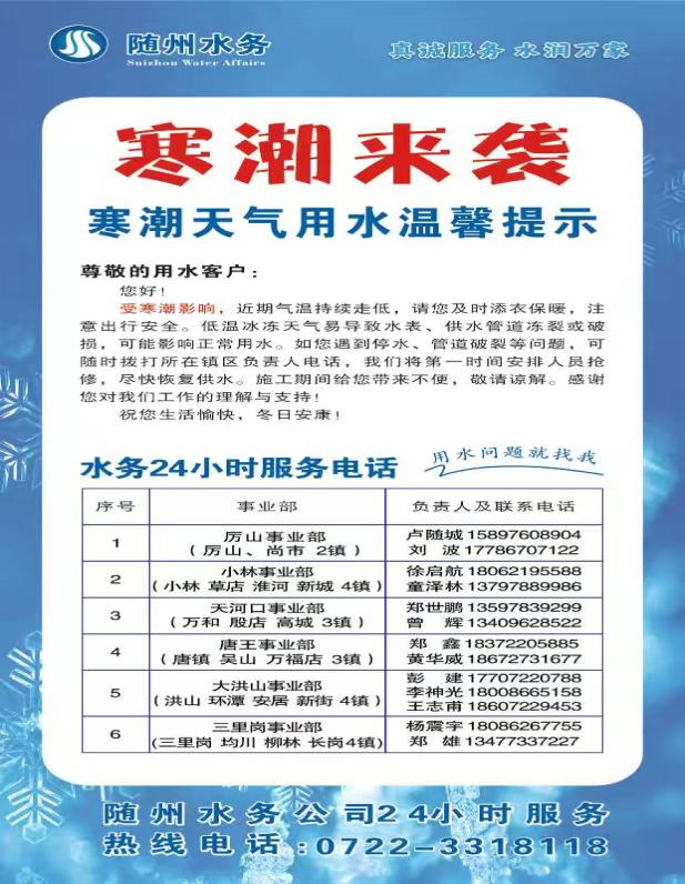 近期,我市持續(xù)遭遇低溫寒潮,嚴(yán)寒天氣對城鄉(xiāng)供水管網(wǎng)及設(shè)施構(gòu)成嚴(yán)峻挑戰(zhàn),水務(wù)集團(tuán)隨縣供水公司迅速激活應(yīng)急響應(yīng)機(jī)制,提前部署筑防線、精準(zhǔn)服務(wù)解民憂、全員堅(jiān)守保暢通的硬核舉措,切實(shí)保障居民冬季用水無憂。